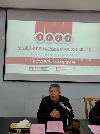 會上,江蘇雙達泵業(yè)股份有限公司董事長吳永貴先生的講話主要分為兩個部分,一是對2022年的工作情況進行總結(jié),二是對2023年度公司的目標任務(wù)進行部署,希望公司全體干部員工緊緊圍繞“搶抓機遇爭創(chuàng)優(yōu)勢,團結(jié)奮進共創(chuàng)輝煌”的總體要求,為2023年公司的揚帆遠航做出新的更大的貢獻。吳董事長還重點向大家介紹了2022年公司IPO進度,同時勉勵大家,在2023年的IPO工作中繼續(xù)拼搏,爭取在本年度實現(xiàn)既定的IPO目標。