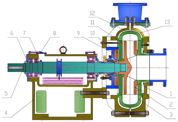 4、采用雙泵殼結(jié)構(gòu)設(shè)計(jì),剖分的泵殼用于承壓,內(nèi)襯用于耐磨。