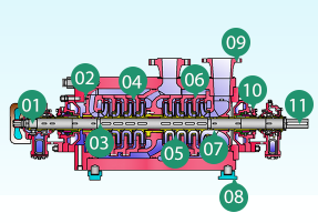 7.導(dǎo)向設(shè)置:筒體設(shè)有導(dǎo)向鍵及定位銷,當(dāng)輸送高溫介質(zhì)時,泵向非驅(qū)動端延伸,不影響與驅(qū)動機之間的聯(lián)接,保證運行可靠。